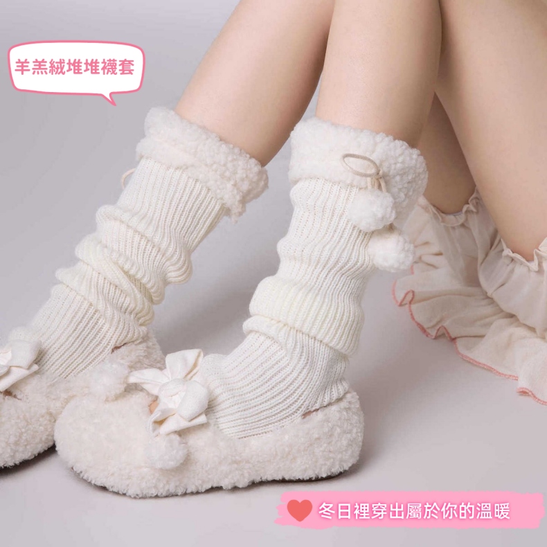 日系洛麗塔蝴蝶結可愛毛球襪套 冬季保暖羊羔絨腿套堆堆襪
